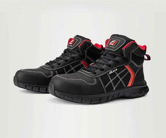 适合多水、弱酸碱及长时间行走工况下使用,使用寿命优于常见牛皮+橡胶或牛皮+PU材质安全鞋。